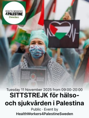 Den 11e november anordnar vi Health Workers for Palestine - Sverige en sittstrejk utanför riksdagen i samband med utfrågning av utrikesministern Maria Malmer Stenergard om Sveriges åtaganden enligt folkmordskonventionen. Plats: Riksgatan vid Stallbron (mot Mynttorget)Tid: 11e november kl. 09-20Arr: Health Workers 4 Palestine - Sverige/Stockholm Vi kräver att Sverige agerar:- Återinför biståndet till UNRWA - Aktivt verkar för att utreda krigsbrott mot sjukvården i Gaza- Tar emot patienter från Gaza för vård i Sverige- Aktivt verkar för att Israel ska frige Dr Hussam Abu Safiya samt övriga av våra palestinska kollegor som hålls olagligt frihetsberövade - Verkar för att stoppa medicinsk apartheid Trots överenskommelsen om vapenvila, släpps fortfarande inte den mängd nödhjälpsom behövs för att tillgodose behoven. Internationella domstolen i Haag har slagitfast att Israel är skyldig att släppa in nödhjälp till Gaza och släppa fram UNRWA.Sverige stoppade biståndet till FN-organet. Med stöd i domstolens utlåtande, krävervi att Sverige återinför biståndet till UNRWA.Enligt fjärde Genèvekonventionen ska sjukhus, sjukvårdsarbetare och sjuktransporterskyddas i krig. FN och människorättsorganisationer rapporterar att Israels attackermot sjukvården i Gaza varit avsiktliga och systematiska. Folkrätten gäller alla – utanansvar riskerar även vi vår trygghet. Sverige måste försvara folkrätten och verka föratt krigsbrott mot sjukvården i Gaza utreds.Hundratals hälso- och sjukvårdsarbetare har tillfångatagits och hållits i israeliskafängelser utan vare sig åtal eller rättegång. Tortyr rapporteras och fem läkare hardödats under fångenskap. 95 vårdsarbetare hålls fortfarande frihetsberövade. Blanddessa barnläkaren dr Hussam Abu Safiya, vars advokater meddelat att hansgodtyckliga fängslande förlängts med sex månader. Vi kräver att Sverige agerar förderas frigivning.Efter att Gazas sjukvård slagits i spillror väntar över 15 000 patienter, varav 3 800barn, på evakuering. Trots FN:s och EU:s vädjanden har Sverige inte tagit emotnågra patienter, trots att flera sjukhus, bland annat Karolinska Universitetssjukhusetoch Aleris, erbjuder kapacitet. Vi kräver att Sverige tar emot patienter från Gaza nu.Det palestinska hälsosystemet har länge försvagats genom blockad av medicinskutrustning och läkemedel samt förstörelse av vårdinfrastruktur ochrörelsebegränsningar både i Gaza och på Västbanken – en form av medicinskapartheid som skapar död och ojämlik vård. Detta leder till onödiga dödsfall ochunderminerar självbestämmande inom hälsa. Medicinsk etik omfattar kampen försocial rättvisa och mänskliga rättigheter. Det är vår skyldighet att förespråka en politiksom främjar fred, säkerhet och rättvis tillgång till hälso- och sjukvård för allamänniskor, från Stockholm till Palestina. Vi kräver att Sverige verkar för att stoppamedicinsk apartheid.Flera experter och FN bedömer att Israel begår folkmord mot palestinier. EnligtFolkmordskonventionen är Sverige skyldigt att agera. Som vårdarbetare har vi ettmoraliskt ansvar att kräva skydd för Gaza och rättvisa för offren. Källor: WHO, Regeringen, ICJ, Röda Korset, OHCHR, FN, HRW, B'tselem,Healthcare Workers Watch, MAP, Läkare utan gränser, IAGS. https://www.svd.se/a/Vzyj31/katastrofal-situation-i-gaza-trots-eldupphor https://www.regeringen.se/pressmeddelanden/2024/12/regeringen-okar-dethumanitara-stodet-till-gaza-och-regionen/ https://www.icj-cij.org/sites/default/files/case-related/196/196-20251022-adv-01-00-en.pdf https://www.rodakorset.se/var-varld/krigets-lagar/vad-ar-krigets-lagar/var-finnsreglerna/ https://www.ohchr.org/en/press-releases/2025/08/un-experts-appalled-relentlessisraeli-attacks-gazas-healthcare-system https://gh.bmj.com/content/10/2/e017245 https://www.un.org/unispal/document/ohchr-press-release-29sep25-2/ https://www.hrw.org/news/2024/08/26/israel-palestinian-healthcare-workers-tortured https://www.un.org/unispal/document/statement-gaza-ohchr-25jun24/ https://www.btselem.org/publications/202408_welcome_to_hell https://healthcareworkerswatch.org/ https://www.emro.who.int/opt/information-resources/medical-evacuation-of-patientsfrom-the-gaza-strip.html https://www.hhrjournal.org/2023/12/20/palestine-health-and-settler-colonialism-a-callto-action/ https://www.map.org.uk/downloads/map-al-mezan-access-to-health-online.pdf https://www.ohchr.org/en/press-releases/2025/09/israel-has-committed-genocidegaza-strip-un-commission-finds https://www.amnesty.org/en/latest/news/2025/07/israel-opt-israeli-organizationsconclude-israel-committing-genocide-against-palestinians-in-gaza-in-anothermilestone-for-accountability-efforts/ https://msf.org.uk/issues/gaza-genocide#genocide https://genocidescholars.org/wp-content/uploads/2025/08/IAGS-Resolution-on-Gaza-FINAL.pdfLäs mer...